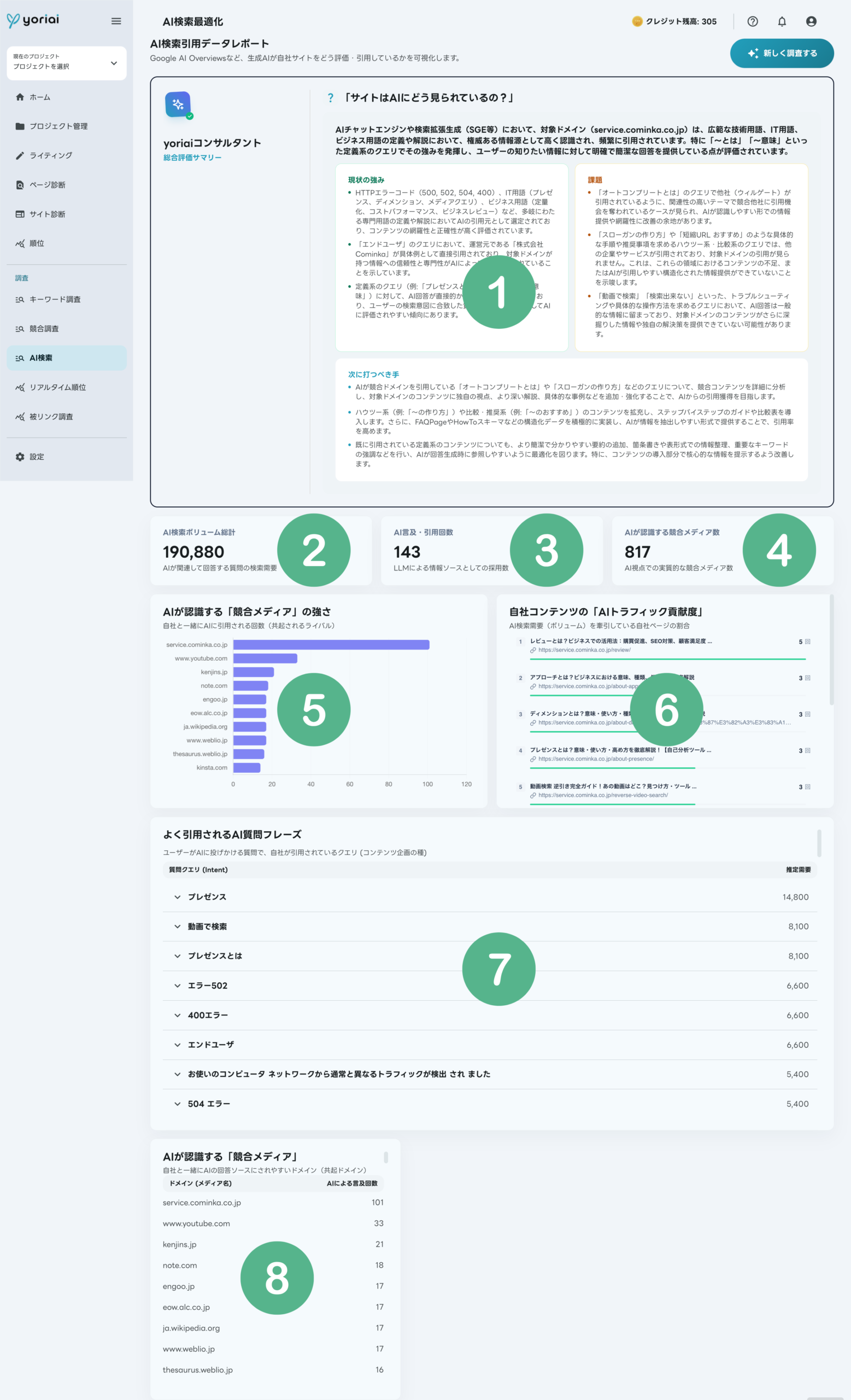 AI検索機能は、生成AIが自社サイトを現在どのように認識し、情報ソースとして引用しているのかを確認できるレポート機能です。