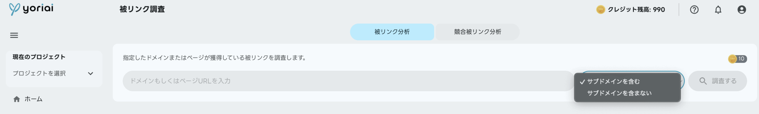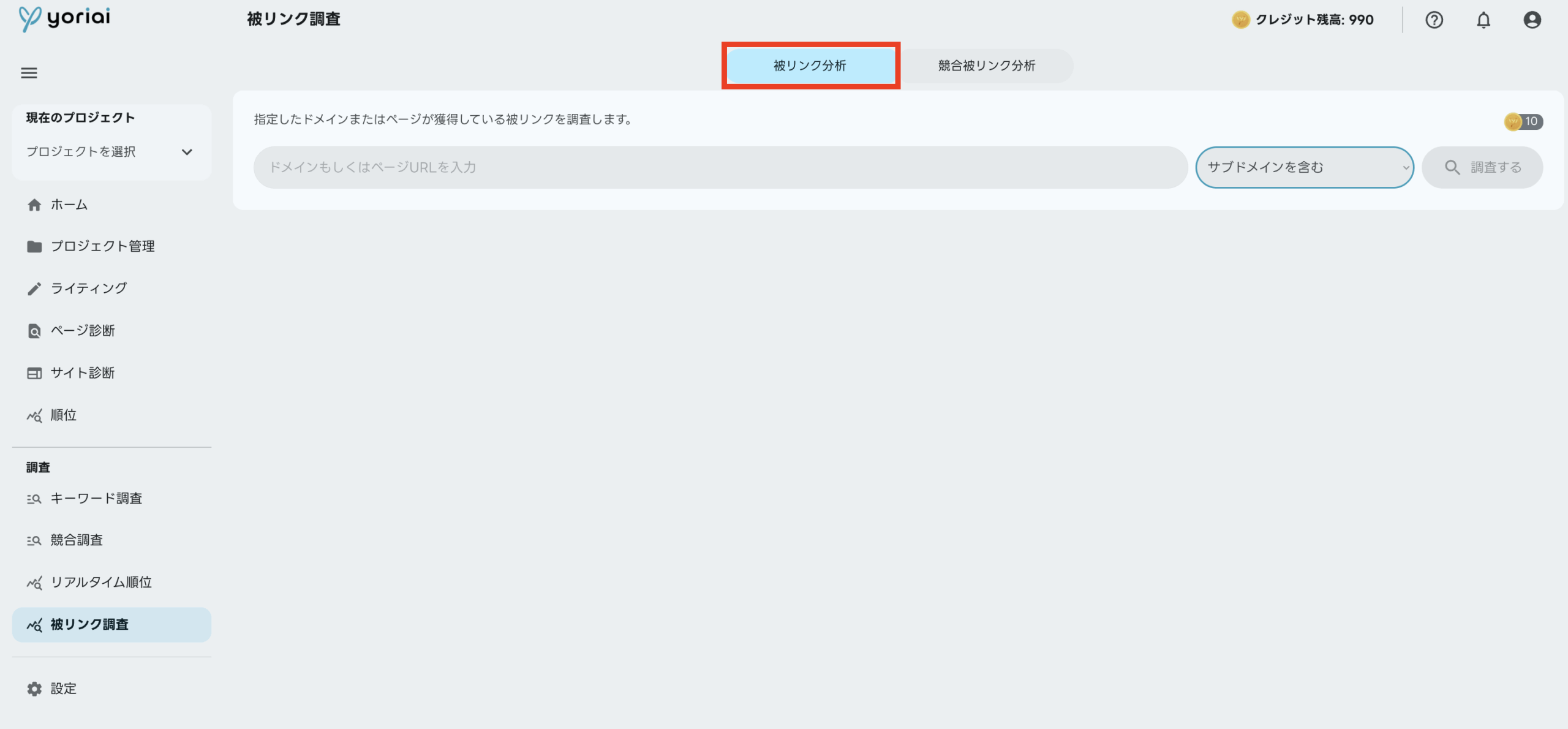 左サイドバーのプロジェクトを選択した上で、「被リンク調査」を選択してください。上のタブが「被リンク分析」になっていることを確認してください。