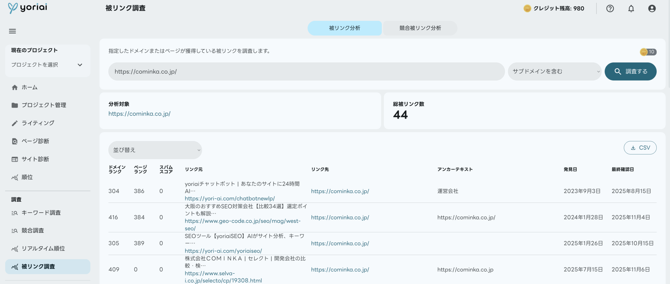 以下にて、yoriaiSEOの「被リンク分析」機能について説明しています。