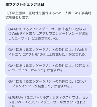 正確性を担保するために人間による事実確認を行うべき箇所を提案します。