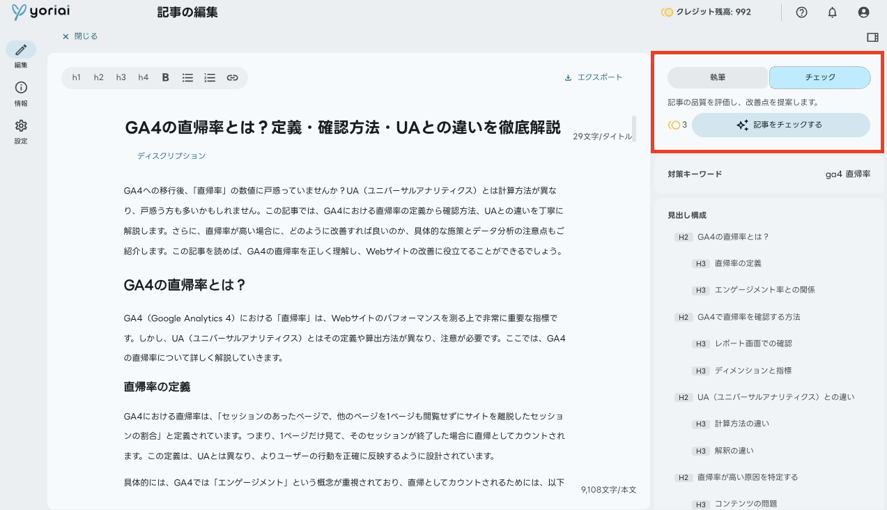 記事編集画面の右側にある「チェック」から、機能をご利用いただくことができます。(※一回の使用で3クレジット消費)